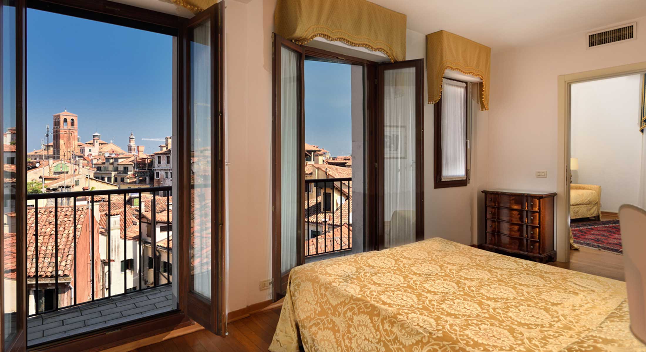 A spacious and elegant Family Suite designed for comfort and relaxation, featuring two bedrooms, one full bathroom, and a large living area. Ideal for families of up to five guests, the suite offers all modern comforts in a refined setting, right in the heart of Venice—perfect for enjoying the city together with ease and style.